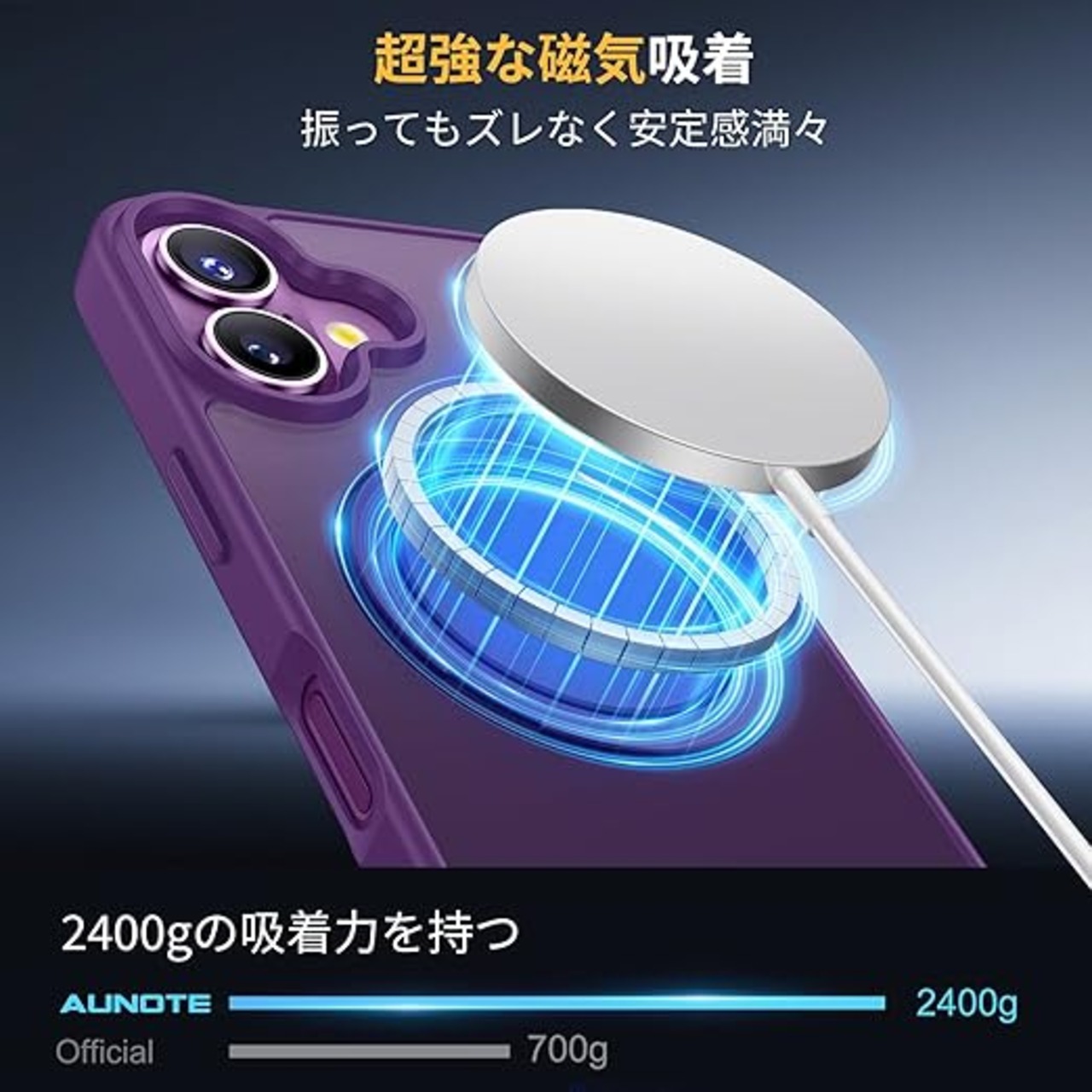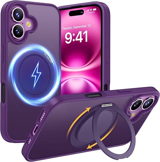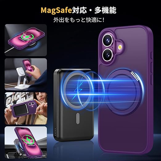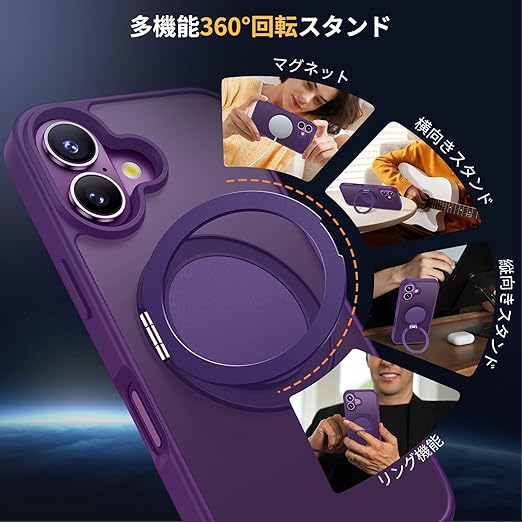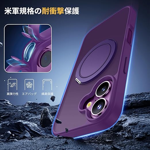 Aunote iPhone 16 ケース MagSafe対応 耐衝撃 360°回転スタンド 縦横両対応 マグネット搭載 黄変防止 マット感 あいふおん16ケース 6.1インチ 半透明・パープル a