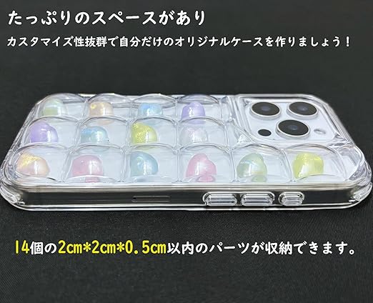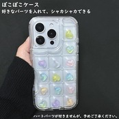 透明感が高くでぽこぽこケースです。中に入れるパーツは全てお好みでセレクト!メタリックビーズ、小さなチャーム、おはじきシールまで 、あなただけのオリジナルケースを作りましょう。存在感抜群でどこでもいつでも注目されて個性的スマホケース。