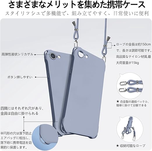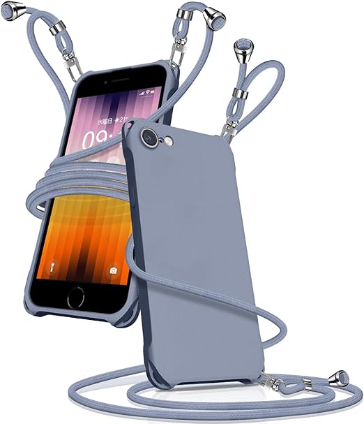 iPhone SE 第3世代 第2世代 ケース ショルダー シリコン iphone 8/7 スマホケース アイフォン7/8/se2/se3 カバー 耐衝撃 肩掛け 斜めかけ 縄掛けケース 紐付き 斜めがけ 織りストラップ付き 長さ調整可能 取り外し可能 傷付き防止 マット質感 指紋防止(グレーブルー) a