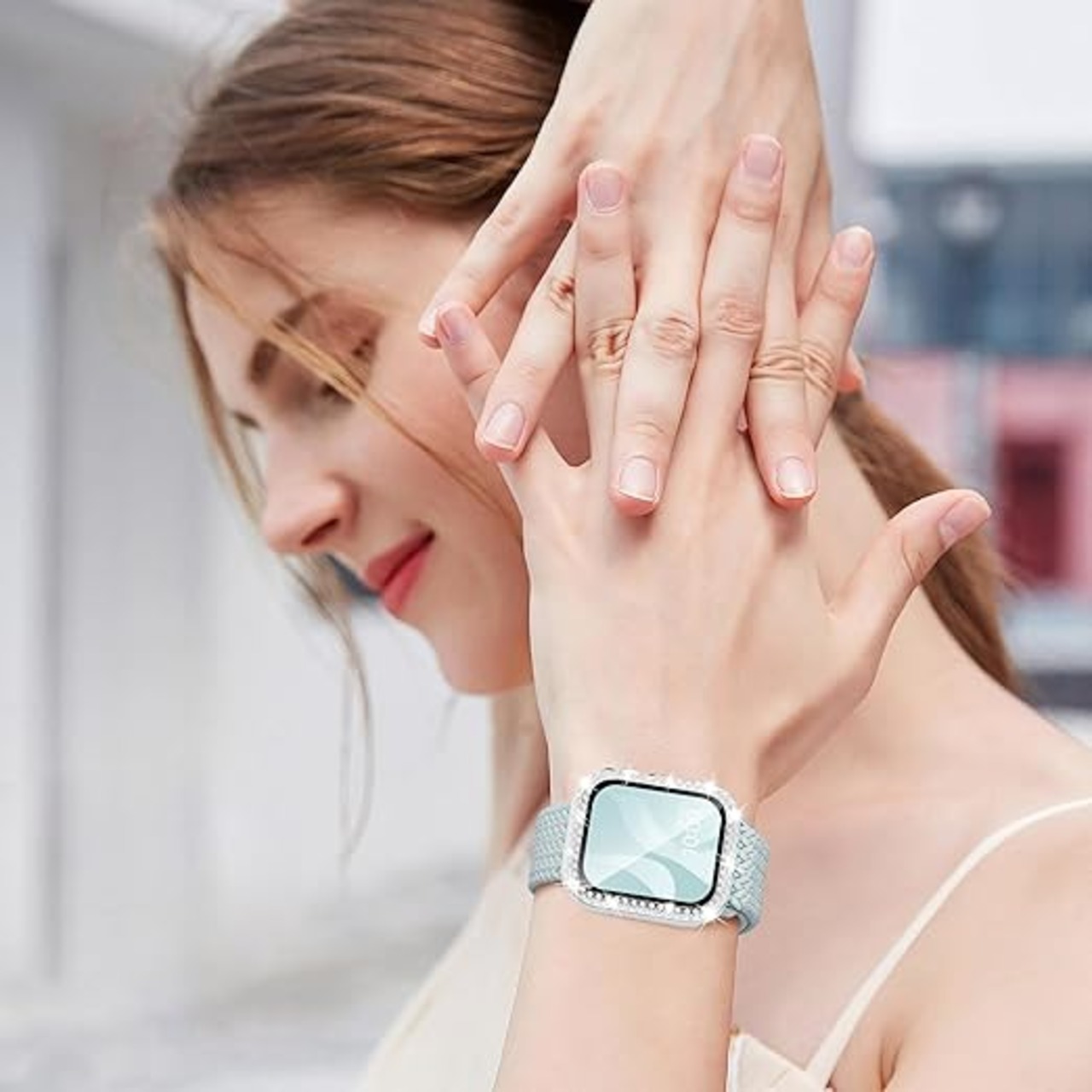 「おしゃれな色合い」日本で人気色味の互換用アップルウォッチ 編み込み バンドと同色のキラキラ カバーをセットにして、スタイルが完璧に馴染みしていて、渾然一