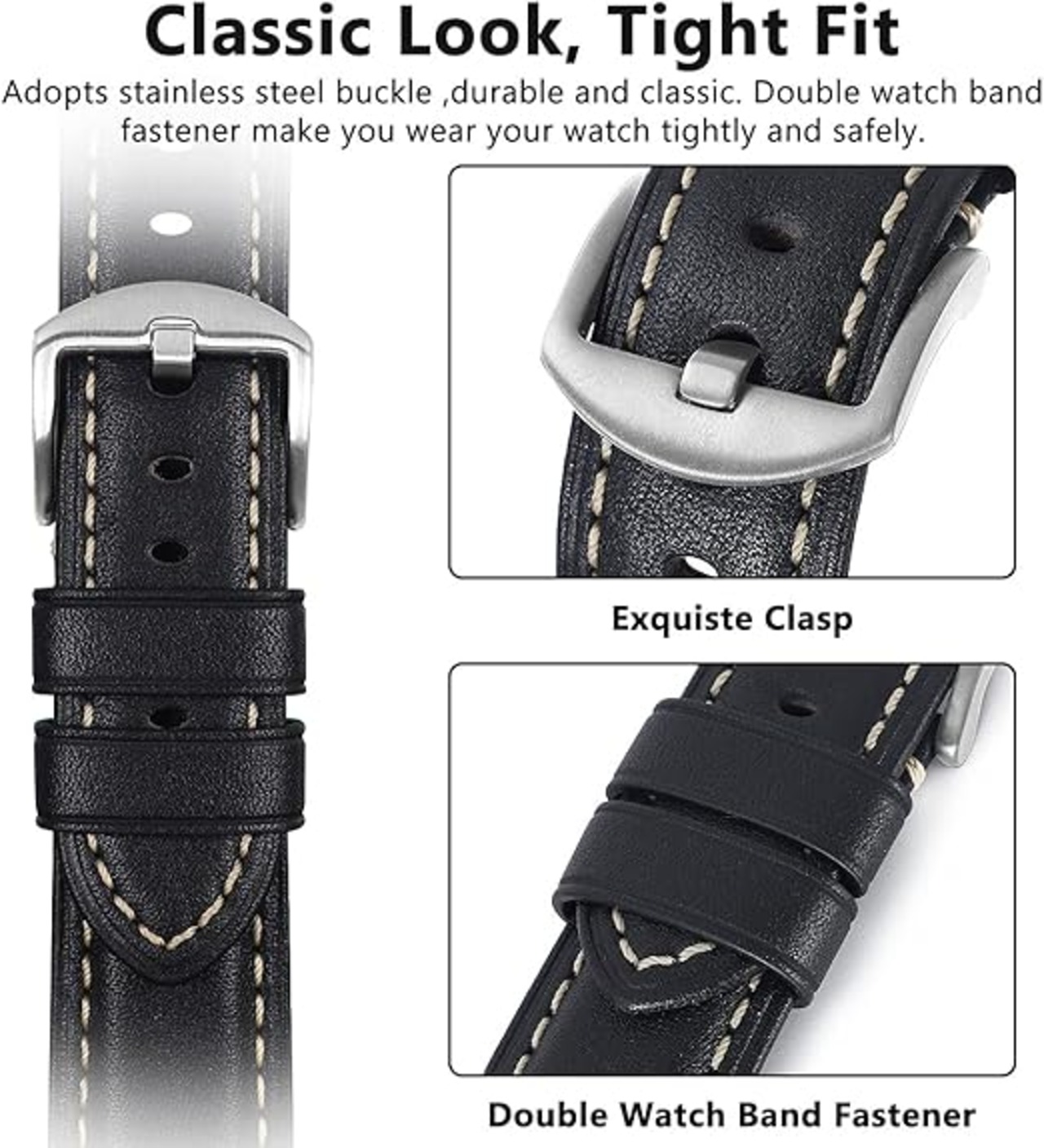 上質な素材を使用:100%本革のストラップ。上質なイタリア製牛革を使用(使い始めは少し硬く、数回使用すると柔らかくなります)。天然皮革のシボが、ストラップにスタイリッシュな雰囲気と質感を与えています。ストラップの裏地にもカーフレザーを使用し、快適な装着感を実現しています。また、磨耗に強いのも特徴です。