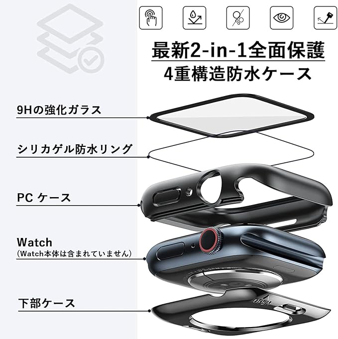 【防水仕様】:特殊な加工により防水機能が付いており、手洗いはもちろん、プールでのワークアウトやキャンプなどのアウトドアでの使用にも適しています。Watchの液晶部と保護ケースの間に水が入り込む心配はありません。ただし、水中での画面操作や写真撮