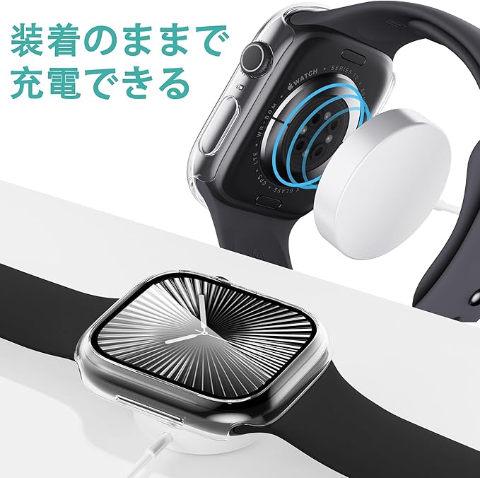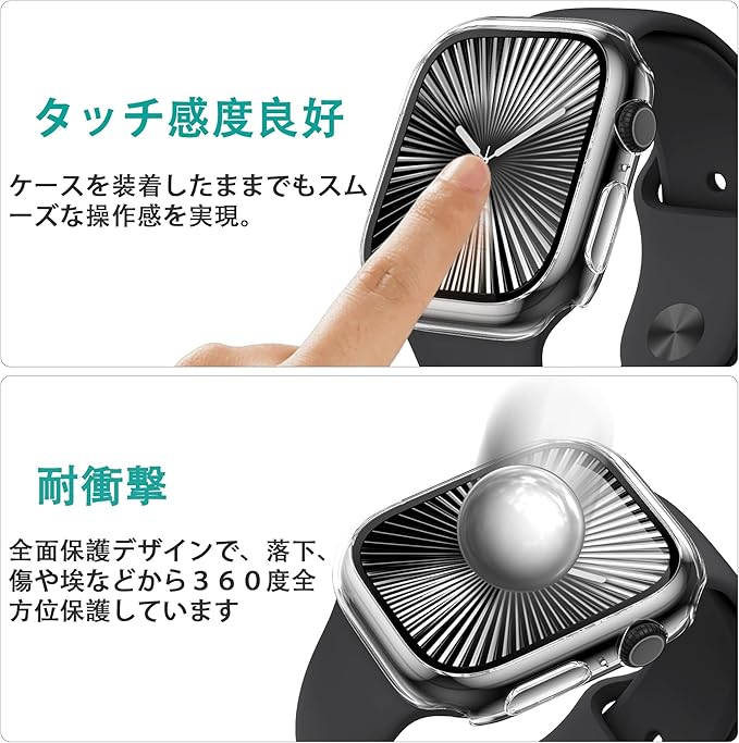 「衝撃に強いAPPLE WATCH 10ケース」耐久性あるPC素材を使用し、端末を衝撃や傷からしっかり保護します。また、液晶面全体を保護する安心の構造で、普段使い程度の落下では