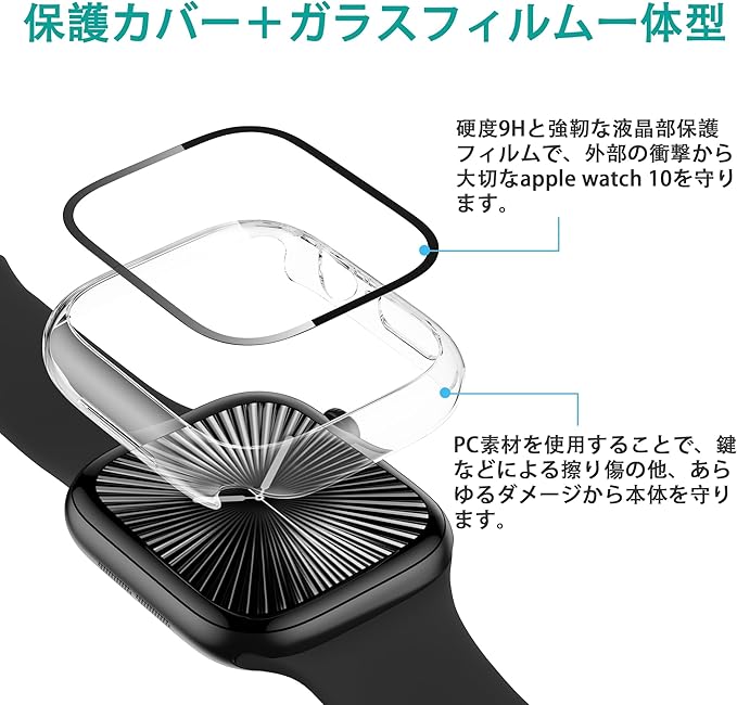 「Apple Watch 10保護カバー+ガラスフィルム一体型」機能性とデザインを兼ね備えて、優れたApple Watch 10ケースです。Apple Watch10に合わせて丁寧に作られたフレームなので、違和感なく本体にジャストフィット!日常で起きる損傷リスクを柔軟で高強度なフィルム層が防ぎ、液晶をキズから保護します。