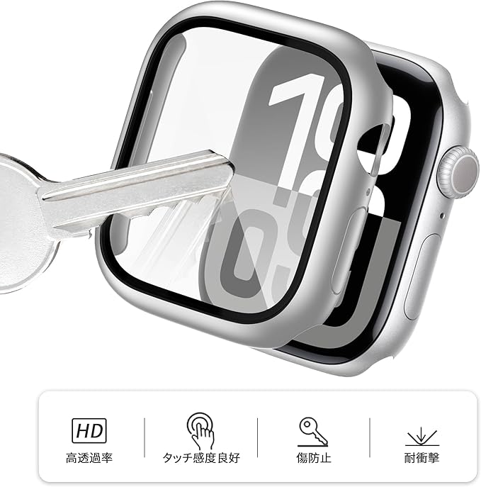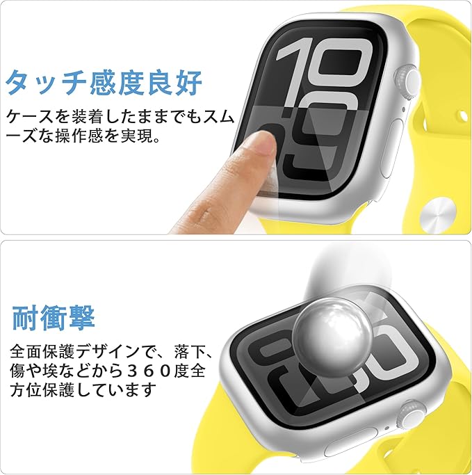 「衝撃に強いAPPLE WATCH 10ケース」耐久性あるPC素材を使用し、端末を衝撃や傷からしっかり保護します。また、液晶面全体を保護する安心の構造で、普段使い程度の落下では