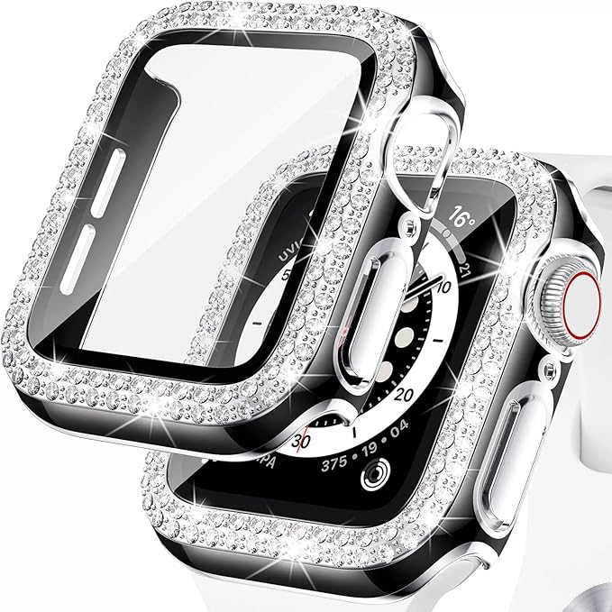 AIYYXX アップルウォッチ カバー40mm 41mm 42mm 44mm 45mm 46mm対応 アップルウォッチ 本体 ダブルダイヤモンド ガラスフィルム付 超薄型 PC+ガラス素材 高透過率apple watch カバーキズ防止 簡単に取り付け・取 全面保護 apple watch ケース(40mm,ダイヤモンド・ブラック&シルバー) a