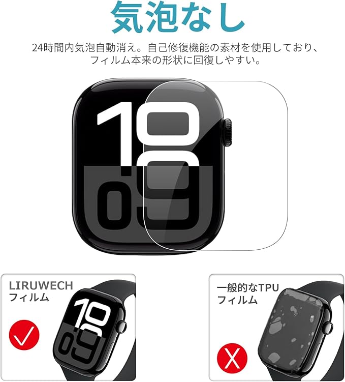 【2024最新デザイン&気泡防止】旧モデルに比べ、apple watch 10保護フィルムの貼り付け方法が改善されました。気泡が入りにくいエアーレス加工が施されています。初心者でも簡単にフィルムを貼ることが可能です。 貼り付けが完了すると、気泡が残る可能性が低く、まるでフィルムがないように。