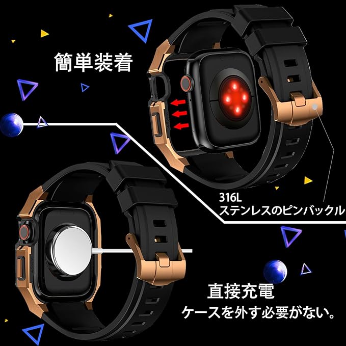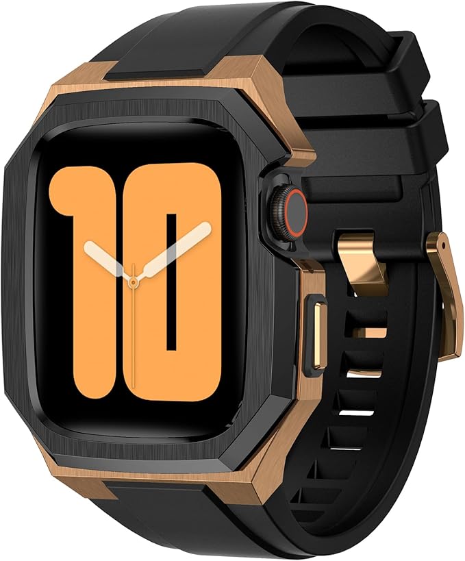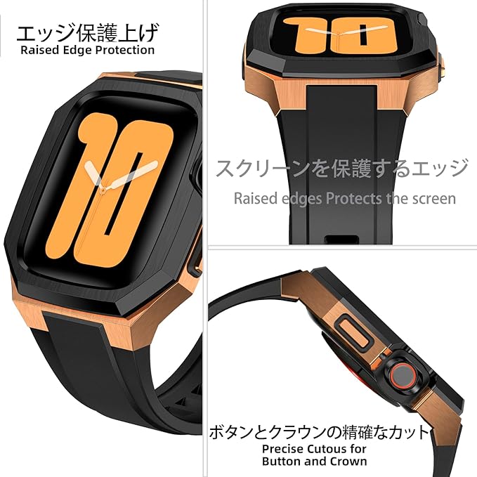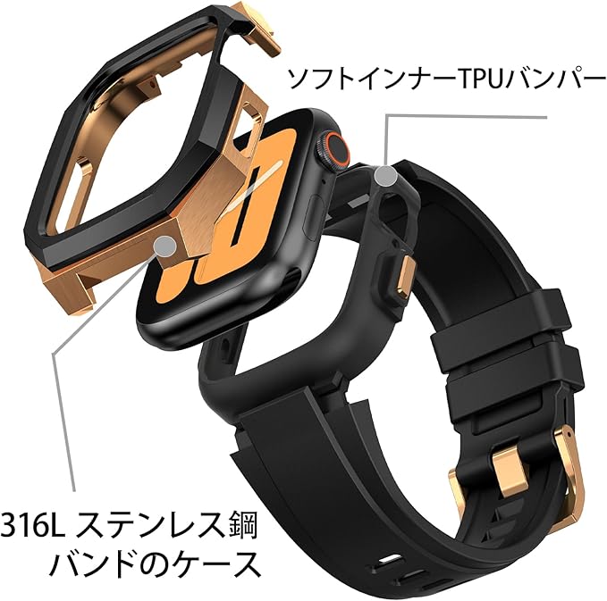 BinGeLi コンパチブル Apple Watch バンド 44mm 45mm 46mm 49mm ステンレス鋼 ケース付き 頑丈なメンズ フッ素ゴムベルド 一体型 スポーツバンド Series 9/8/7 45mm SE2/6/5/4/SE 44mm Ultra 49mm 10/46mm対応 耐衝撃性 落下防止 装着簡単 Watch 保護 カバー デラックス a