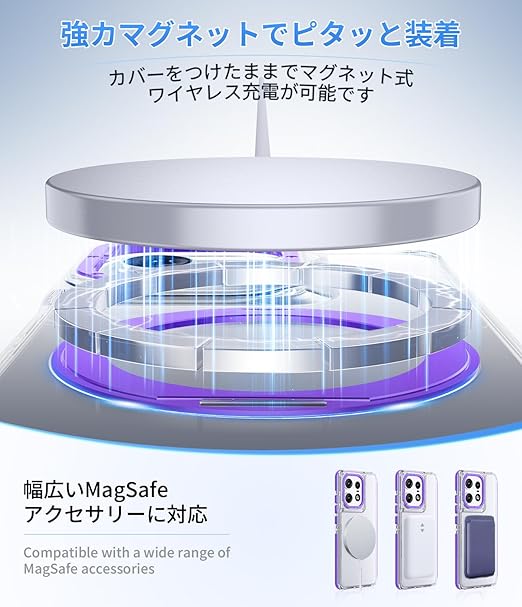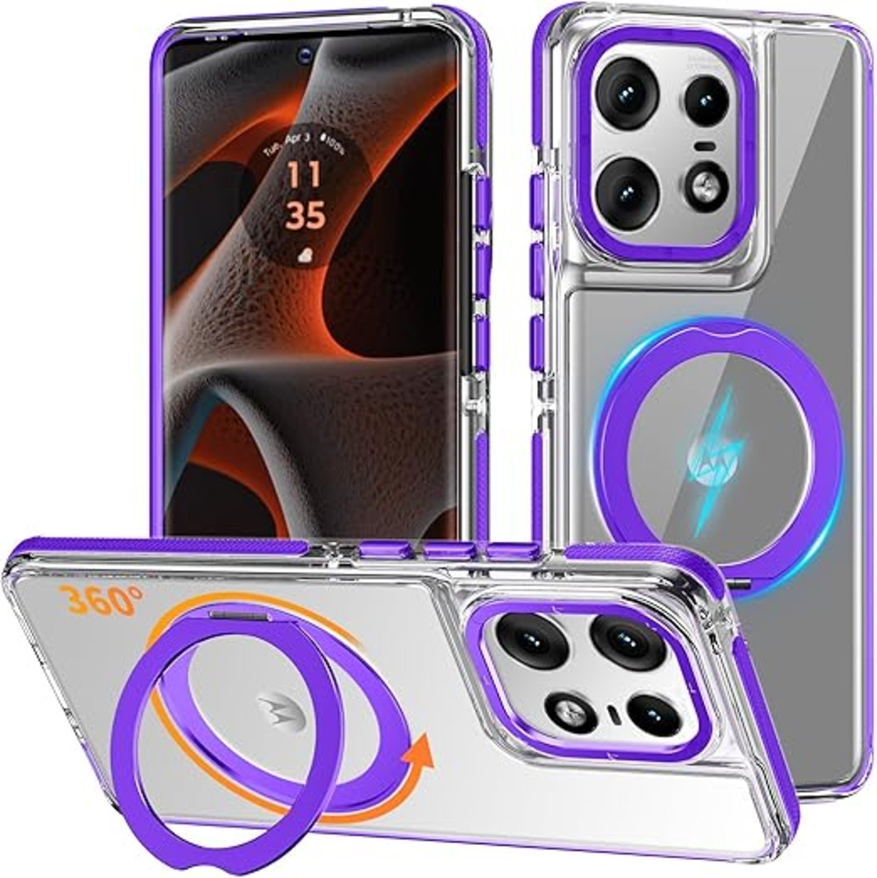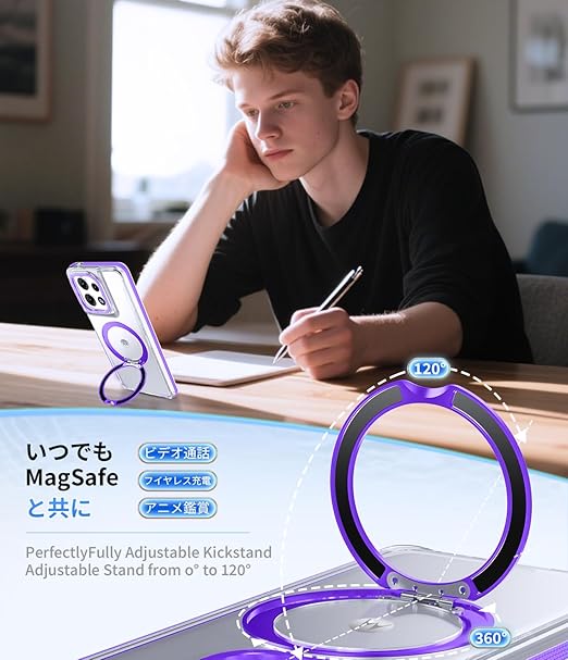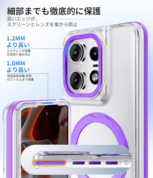 Motorola Edge 50 Pro 用 ケース 強磁力リング マグネット 耐衝撃 米軍MIL規格 クリア ワイヤレス充電対応 360°回転スタンド 縦横両対応 滑り止め 擦り傷防止 edge 50 pro カバー クリア透明 紫 N519-edge 50p-04 a