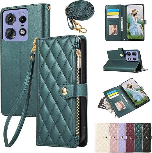 For Motorola Edge 50 Pro ケース 手帳型 Motorola Edge 50s Pro ケース ショルダー ひし形柄 モトローラエッジ50 pro ケース 手帳型 人気 女性 Moto Edge 50 Pro ケース 肩掛け カード収納 ジップ付き財布 横置き機能 シンプル お洒落 スマホケース (ダークグリーン) a