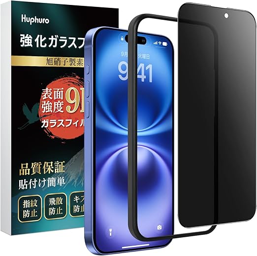 Huphuro【覗き見防止+ガイド枠付き】iPhone 16 ガラスフィルム のぞき見防止 プライバシー保護 日本製素材旭硝子製 硬度9H 耐衝撃 飛散防止 撥水撥油 指紋防止 スクラッチ防止 ガイド枠付き 気泡無し 簡単貼り付 アイフォン16 フィルム a
