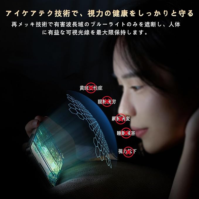 【ブルーライトカット】最新ブルーライトカット反射技術により93%のブルーレイを有効的にフィルタリングでき、目に掛かる負担を軽減し、視力障害を拒否します。長い時間使っても目が疲れません。効果的に近視を予防でき、ディスプレイを長時間眺める方に効果を発揮します。(このHD透明ブルーライト防止保護フィルムは、室内では