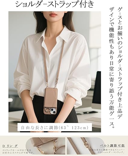 肩掛け&首かけストラップ: ロングモードならジャケットの上から肩掛けでハンズフリーに、ショートモードなら首からブラリとおしゃれに着用可能! 自由に長さ調整できるストラップで、アウトドアや旅行はもちろん、日常の買い物や通勤中も両手がフリーに。アクティブな動きや急な動作でもスマホを安定保持、落とす心配なく快適に使えます