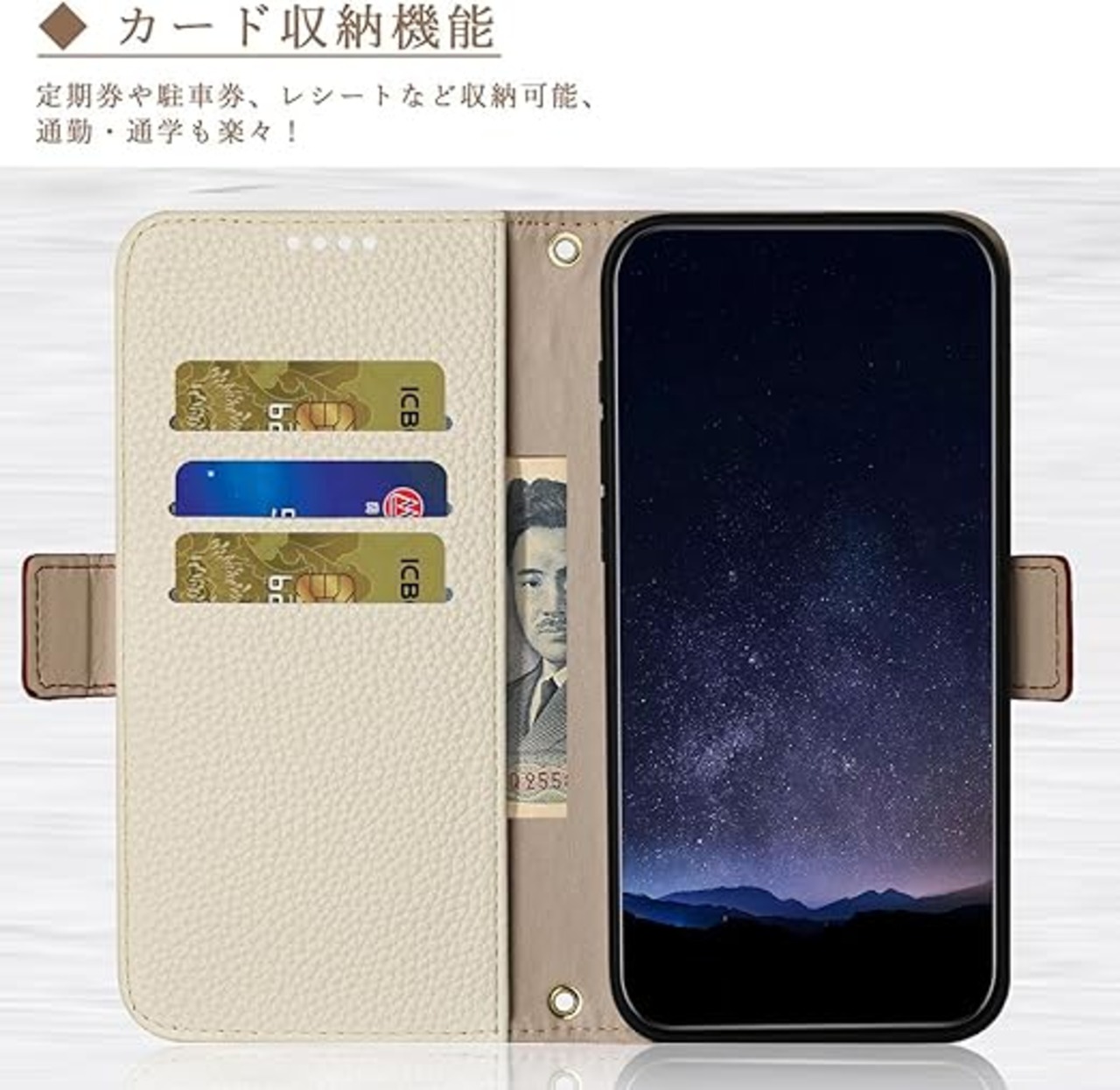 【カード収納】携帯ケース 手帳型は、内には3個の嵌め込みスロ