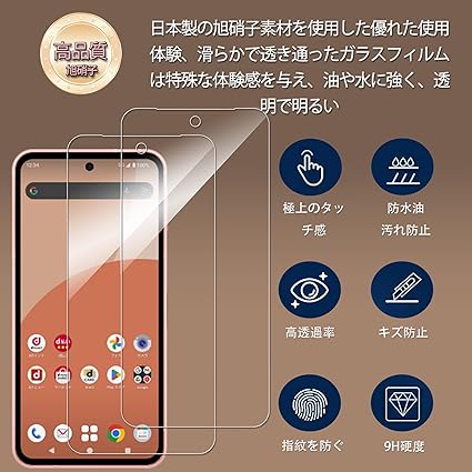 【対応機種】 Aquos sense 9 SH-53E 用 ガラスフィルム(2枚)+専用ガイド枠(1枚)+スクリーンクリーニングキット(2枚)。 ※i購入前に、機種を確認していただきますようお願いいたします。