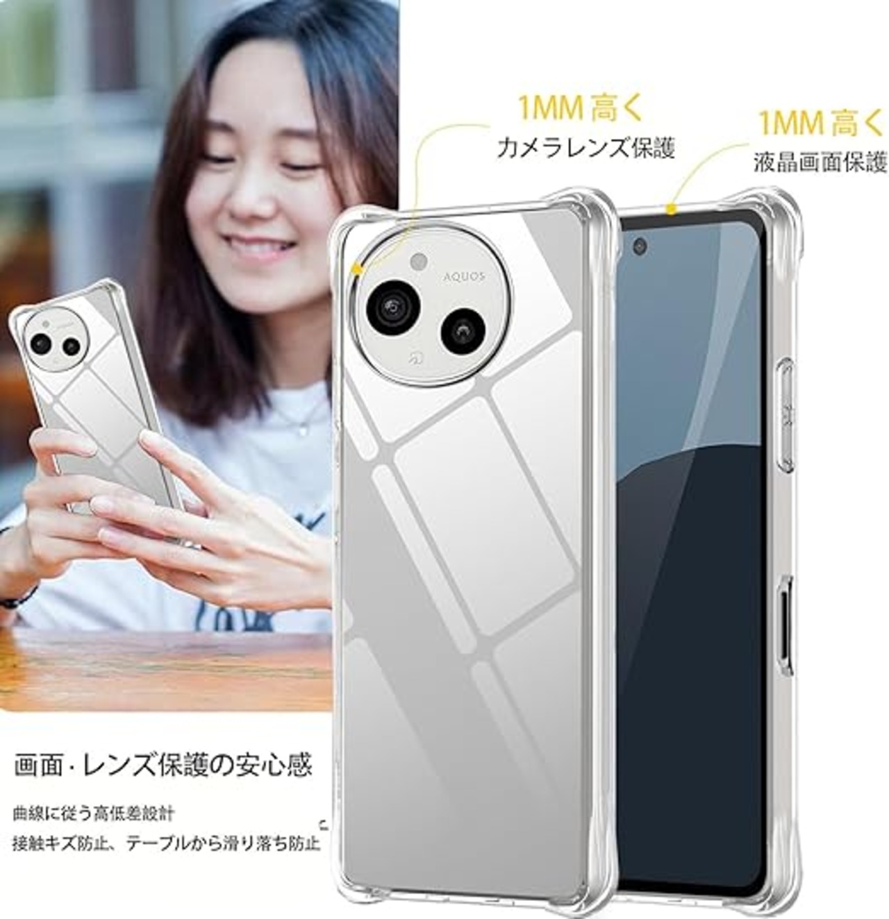 【全面の保護】 AQUOS sense9 SH-53E SHG14 の曲線に従う高低差設計。液晶画面より1mmほど高め、卓上に置いても傷がつきにくく、併用のガラスフィルムまでも保護できる。更に、背面四隅には1㎜の突起があり、滑り止めに