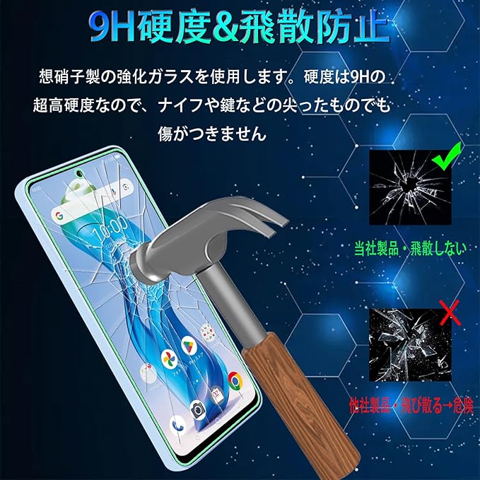 【 表面硬度9H & 飛散防止 】ガラス素材で強い9Hの表面硬度を持っているため、カバンの中の鍵や小銭、砂利や砂など様々な傷から守ります。万が一の破損時も飛散防止加工によって破片はフィルムに張り付いた状態で破片がほとんど飛び散らない安全性の高いガラスになっています。