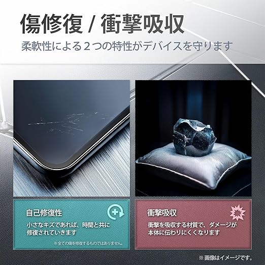 【キズ修復】キズや凹みができた場合でも傷修復に優れた素材のため数時間から数日間で修復されます。※傷の大きさや状態により修復されない場合もあります。【衝撃吸収】衝撃を吸収する素材のため、大切なデバイスへの衝撃を和らげ、しっかり保護します。