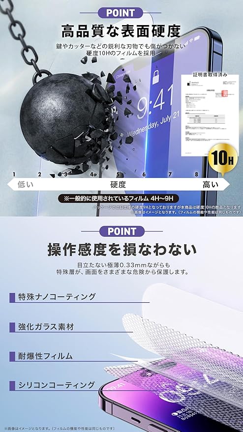 [材質] 一般的なフィルムの3倍以上の最強硬度「10H」強化ガラスを使用。日常生活で起こりうる細かい小傷を防ぐことができます。