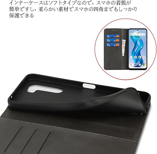 【機能性②】:内蔵マグネットの手帳型ケースです、留め具の邪魔無し、滑り防止の素材を採用され、とてもシンプルな感じで、しかも持ち易いて、使い勝手がよいのです。