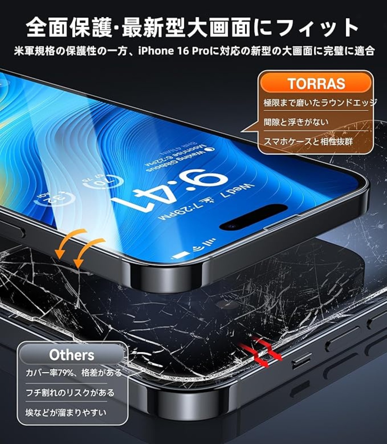 TORRAS iPhone 16 Pro 専用 ガラスフィルム 全面保護 「米軍規格・隅々まで全面保護」指紋防止 強化極細黒縁 9H越え 新型枠付き 貼り付け簡単 さらさら 2枚セット 2024 6.3インチ 干渉しない アイフォン16Pro 用 保護フィルム GlassGo Air a
