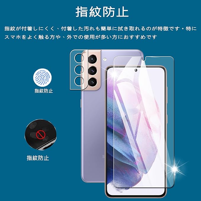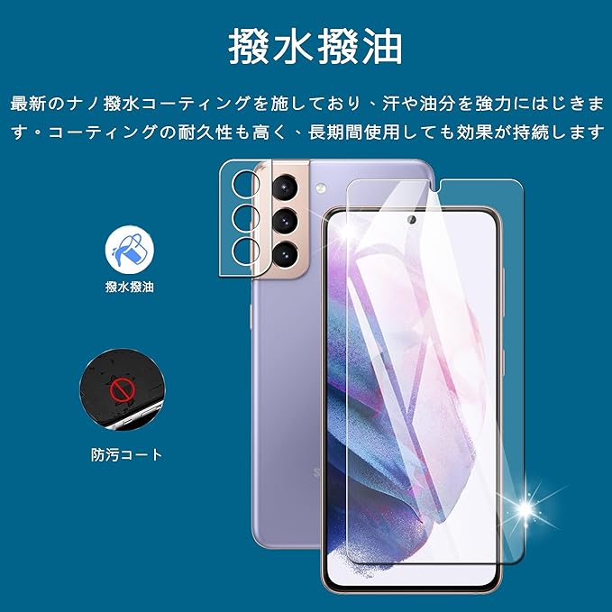 【超お得な4枚セット!】:Galaxy S21 用の フィルム 2枚+Galaxy S21 用の カメラフィルム 2枚。別途ご購入いただく必要はなく、画面からレンズまで一括で保護できます
