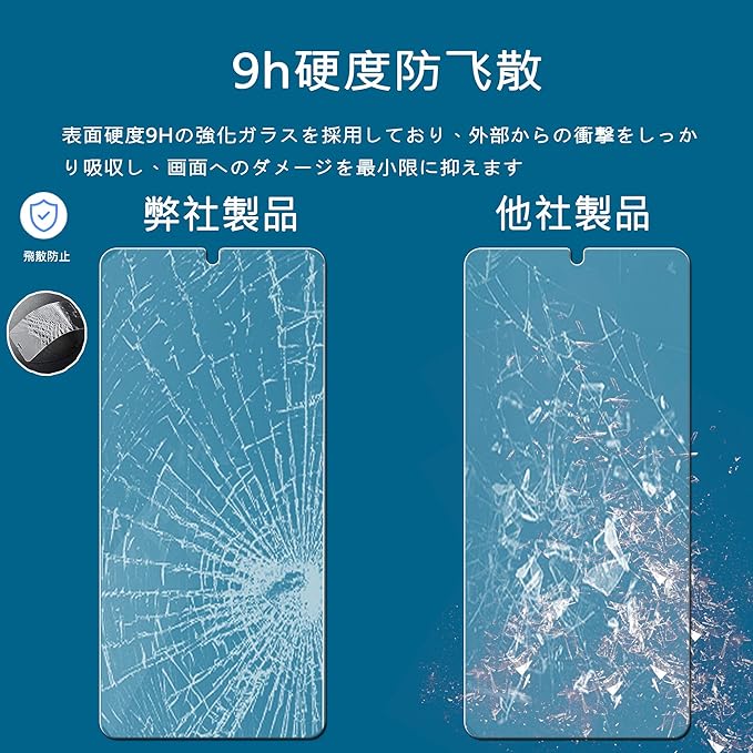 【9H硬度 飛散防止】:表面硬度9Hの強化ガラスを採用しており、外部からの衝撃をしっかり吸収し、画面へのダメージを最小限に抑えます。万が一割れてしまった場合でも、飛散防止加工により破片がフィルム内にとどまり、飛び散らず安全です