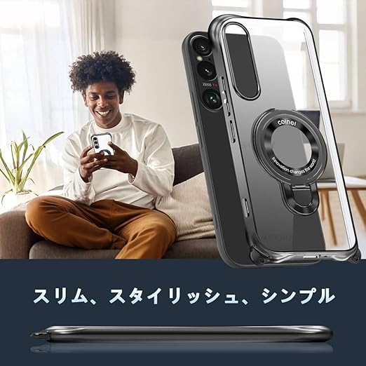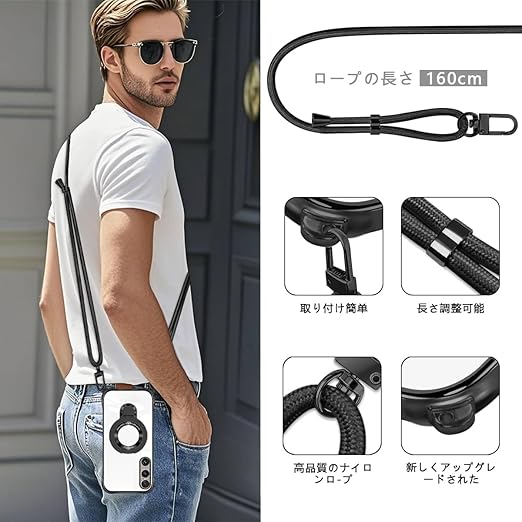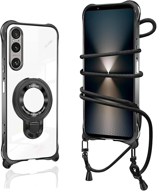 SONY Xperia 1 VII ケース クリア ショルダー 透明 SO-51F/SOG15 リング付き xperia1 vii カバー スタンド機能 エクスペリア1 Vii ケース マグネット搭載 360°回転スタンド 耐衝撃 米軍規格 紐付き 斜めがけ 織りストラップ付き ネックストラップ ショルダー 縦/横 2WAY 長さ調整可能 取り外し可能 落下防止 紛失防止(ブラック) a