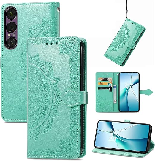 に適用するXperia 1 VII SO-51F ケース 手帳型 ノートブック型携帯電話保護カバー多機能ホルスター財布ホルダーバンプパターンテクスチャ耐久性摩擦耐性ケース男性と女性に適した (マンダラグリーン) a