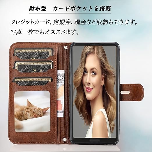 ❷【収納性・財布型】ケースの裏側にカードポケット2つ,クレジットカード、idカード、定期券を収納可能、透明ポケットに写真、名刺入れも可能です。❸【横置きスタンド機能付き】動画の視聴やテレビ電話などを長時間行っても疲れません