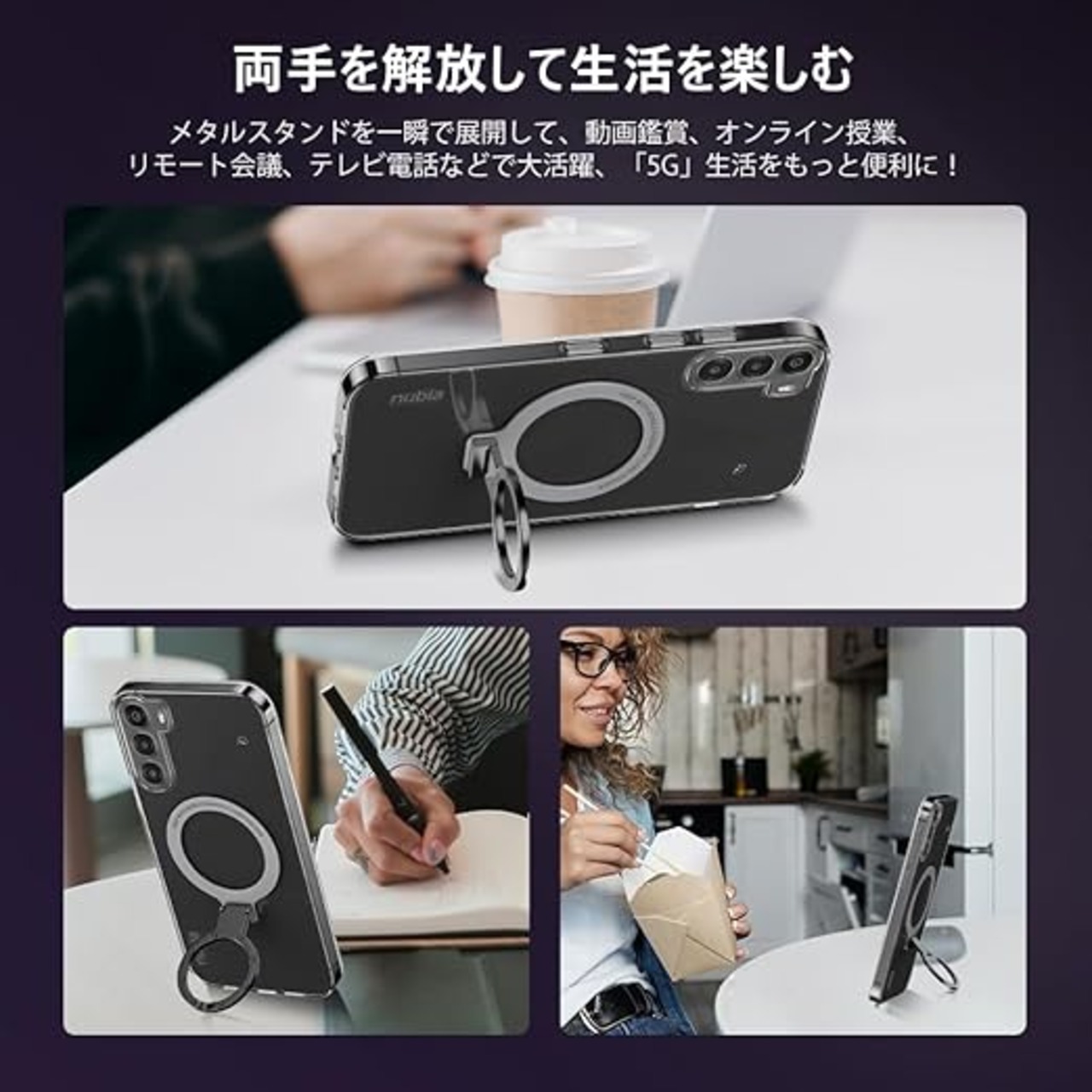 【スタンド機能】多機能スタンドとリング一体型の斬新なデザインです。隠しスタンドの設計で、省スペース性に優れ、収納するときは水平的に置けできて、持ち運びの邪魔になりません。縦置きでも横置きでも安定して支えられ。FaceT