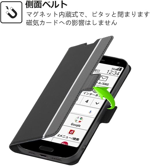 【特徴1】:ピタッと閉めるマグネット式の留め具は側面に設置されたゆえに、フリップの真正面に何の邪魔も無しで持ち心地と使い勝手が良いのです。余計な飾りと模様も一切無しで、とてもシンプルの感じがします。どんな場所でも違和感な