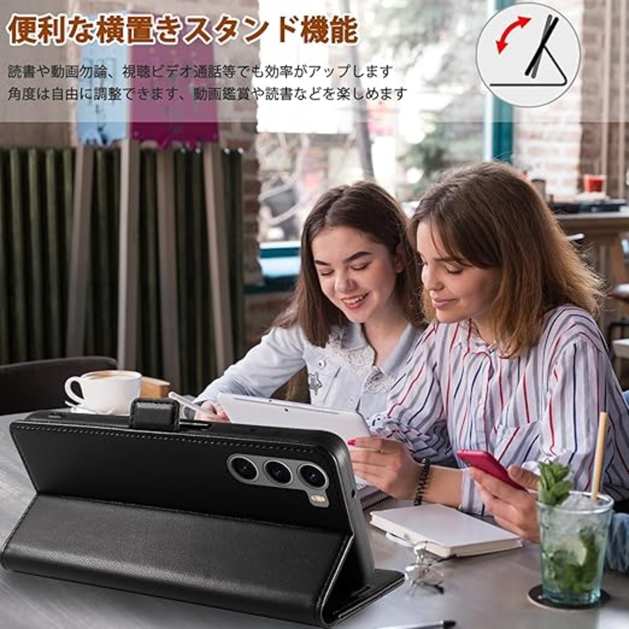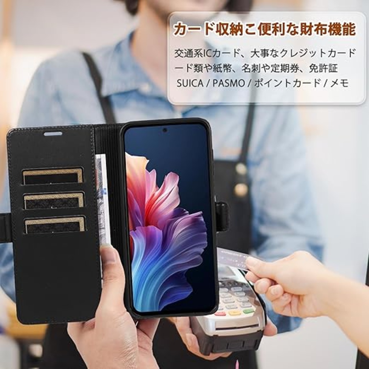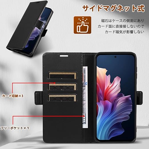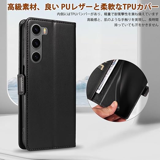 「高級素材、柔らかいTPUケース手帳型」① 肌触りの良い PUレザーと柔軟なTPUカバーを組み合わせ、厳選された革を採用しています。目に見える高級感と、肌のような手触りを実現し、長時間持っていても汗を