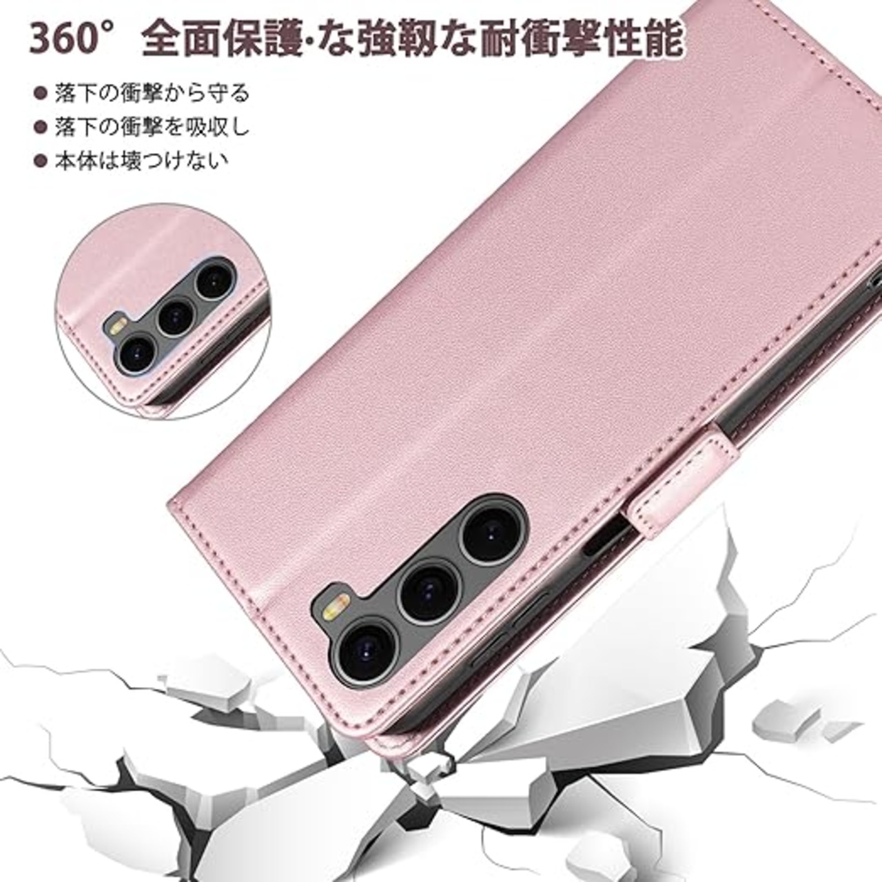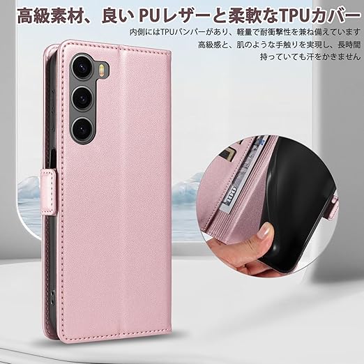 「高級素材、柔らかいTPUケース手帳型」① 肌触りの良い PUレザーと柔軟なTPUカバーを組み合わせ、厳選された革を採用しています。目に見える高級感と、肌のような手触りを実現し、長時間持っていても汗を