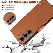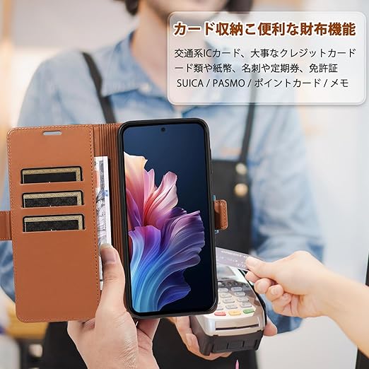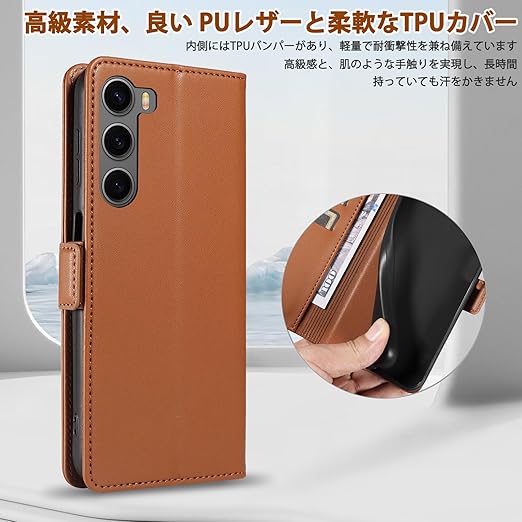 「高級素材、柔らかいTPUケース手帳型」① 肌触りの良い PUレザーと柔軟なTPUカバーを組み合わせ、厳選された革を採用しています。目に見える高級感と、肌のような手触りを実現し、長時間持っていても汗を