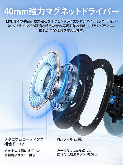 【40mm大口径ドライバー搭載】独自開発の40mm強力マグネットとチタンコーティング複合ダイアフラムドライバーを搭載。40kHzまでの周波数を拡張し、高解像度な音楽の繊細なディテールを捉えます。