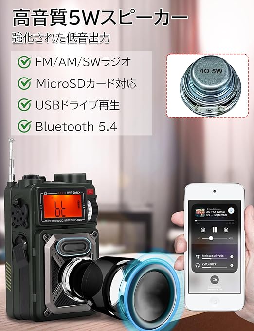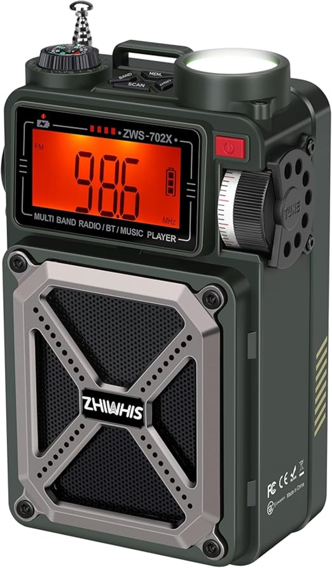 ZHIWHIS Bluetoothスピーカー 防災ラジオ FM/AM/短波/ワイドFM対応 懐中電灯 ソーラー/手回し/USB-C充電 SOSアラート/MicroSDカード対応/USBドライブ再生/4000mAH/技適取得済 アウトドア BCLラジオ 新登場ZWS-702X a