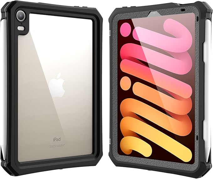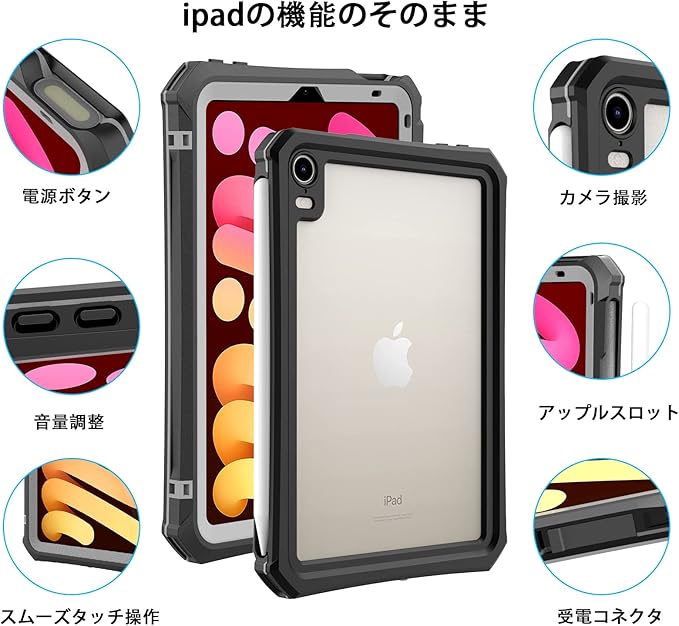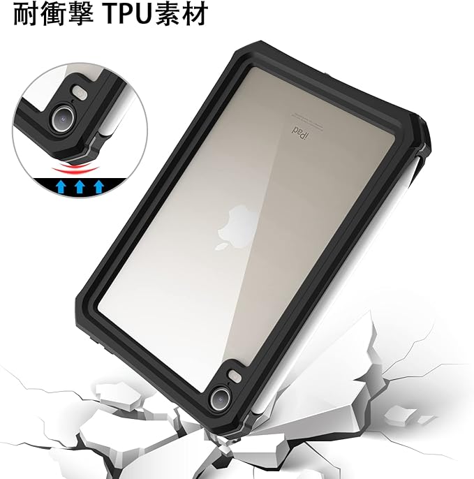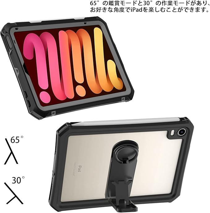 ipad mini7/mini6 防水ケースカバー2021第6世代 8.3インチ IP68 防水規格 軽量 薄型 耐衝撃 水場 全面保護 安心感 スタンド機能付き ストラップ付き スタンド機能 アウトドア お風呂 プールA2567/ A2568/ A2569 (ブラック) a