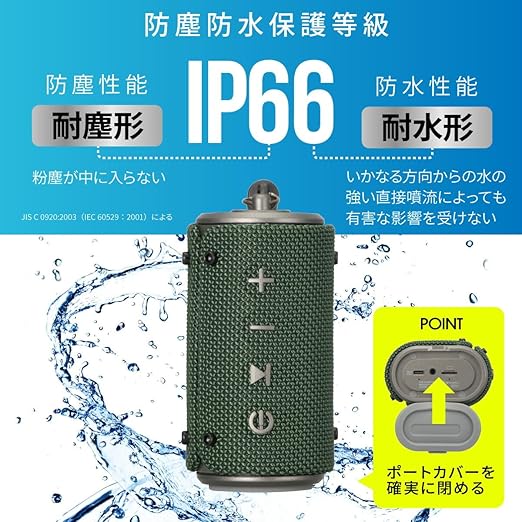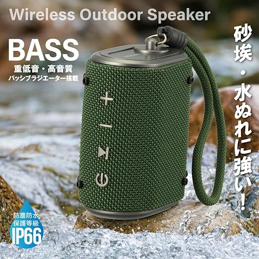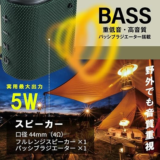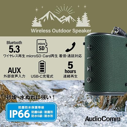 【 特 長 】 ◆砂埃・水ぬれに強い、防塵防水保護等級IP66(防じん6級:耐じん形、防水6級:耐水形) ◆重低音・高音質、パッシブラジエーター搭載で野外でも音質重視 ◆Bluetooth5.3でワイヤレス再生 ◆microSD Card再生 ◆着信・通話対応 ◆AUX 外部音声入力 ◆USB-C充電式 ◆5時間連続再生