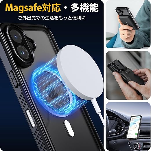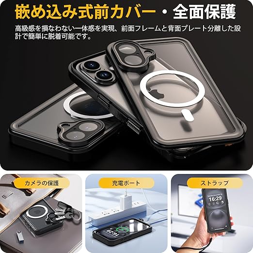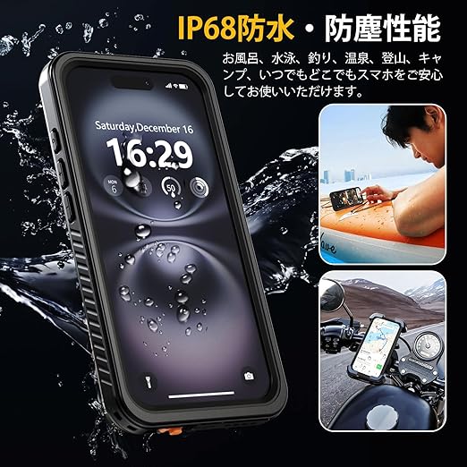 【IP68防水認証取得】iPhone 16 専用の完全防水防塵ケースです。最高防水レベルのIP68認証を取得し、水深さ2Mの水中に1時間まで水没でき、さらに水中撮影でも対応出来ます。防水機能だけでなく、砂・ホコリ・ゴミなどの侵入も防ぎますので、お風呂、水泳、釣り、温泉、登山、キャンプ、いつでもどこでもスマホをご安心してお使いいただけます。