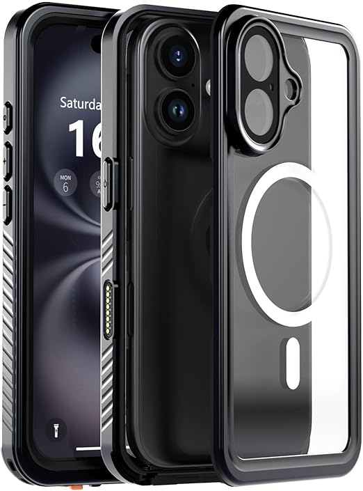 【防水・米軍基準・MagSafe対応】UMITTOS iPhone 16 用 ケース 防水 衝撃吸収 水中撮影対応 顔認証対応 全面保護 完全防水 防雪 防塵 滑り止め 手持ちやすい 頑丈 耐衝撃 ストラップ付き 雨の日、お風呂など適用 防水ケース(6.1インチ) a