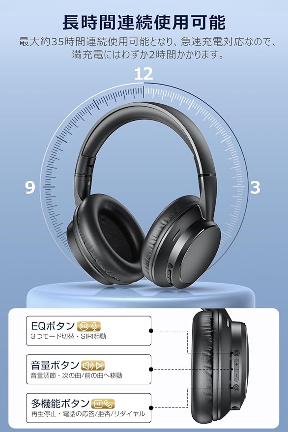 【最大35時間の連続再生が可能&無線・有線両方対応】ワイヤレスヘッドホンは500mAh大容量のバッテリー付き、省電力設計により1回のフルー充電で最大35時間の連続使用が可能です。音楽なら約300曲以上聴することが可能です。ワイヤレスの無線接続により、市販されている99%以上のBluetoothデバイスに適用されます。また、付属の3.5mmオーディオケーブルの有線接続でPC、パソコン、タブレット、スマホなどのデバイスと接続して使用できます。バッテリーが切れた場合や、Bluetooth機能を持たない