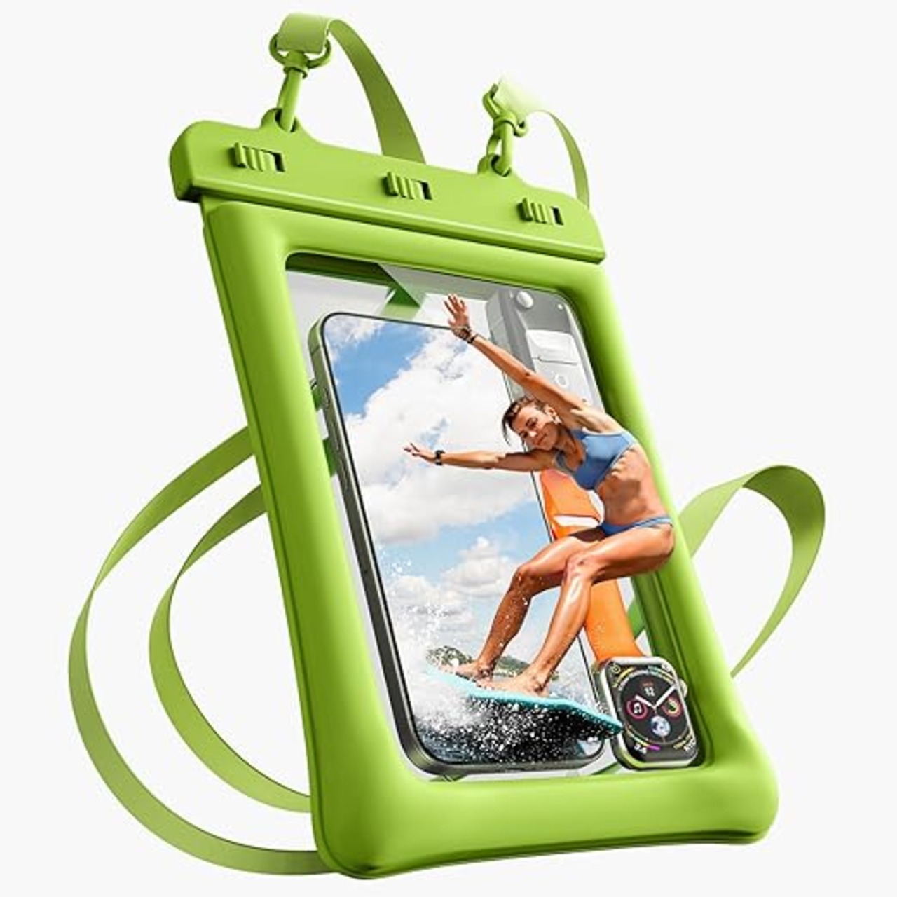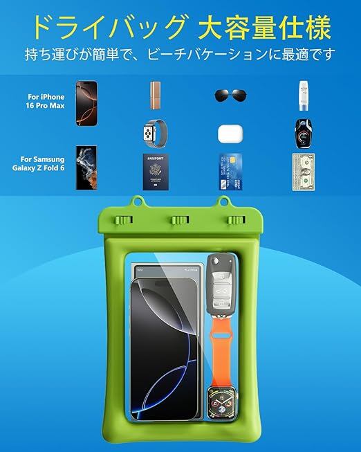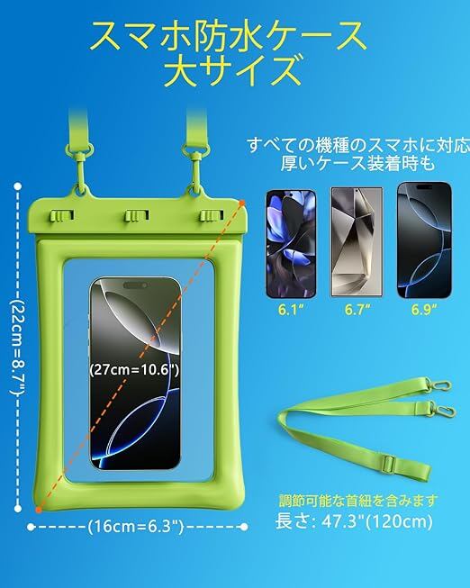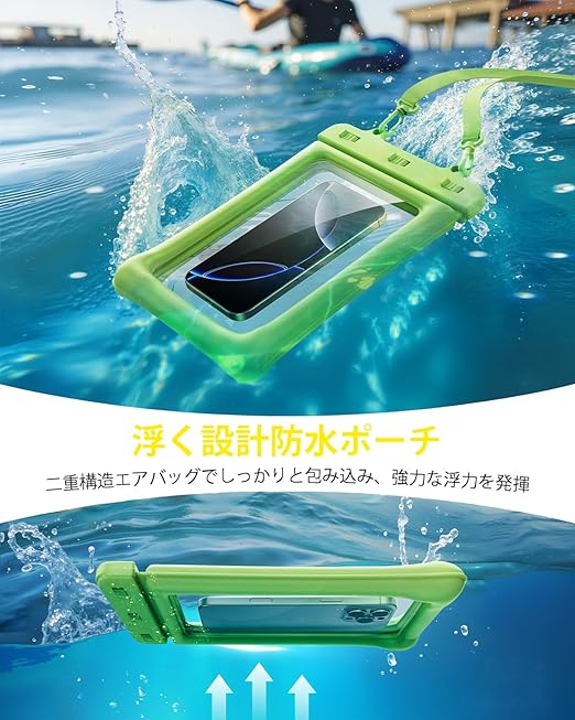 OATSBASFスマホ 防水ケース大きなサイズの防水ポーチ 寸法:22cm×16cm 水中撮影for iPhone16/15/14/13/12 用 浮遊型スマホカバー 調節可能な首かけ 水中での画面タッチ対応透明携帯ケース 雪遊び/スキー/登山/釣り用 (緑) a