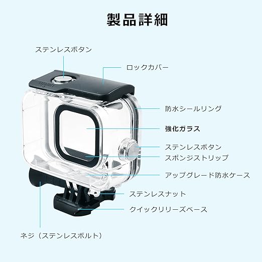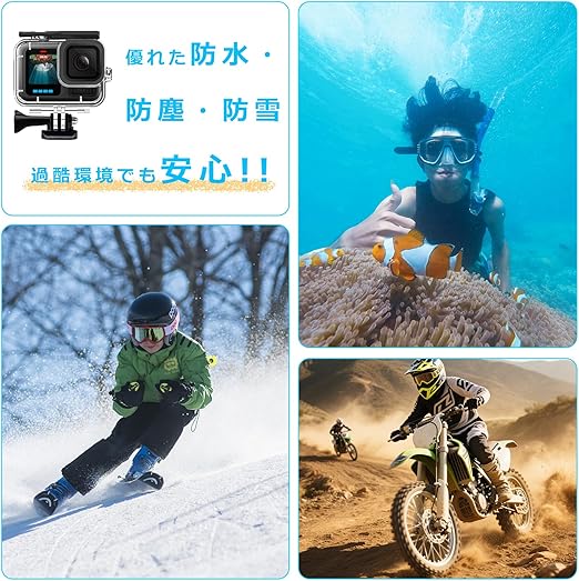 【水中カメラ用 防水ハウジングケース】この製品はゴープロ アクセサリーとして、gopro hero13、gopro12、gopro11、gopro hero10、ゴープロ9に対応した専用設計の防水ケースです。水中での撮影時にカメラ本体を傷や衝撃、ほこりからしっかりと保護します