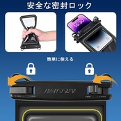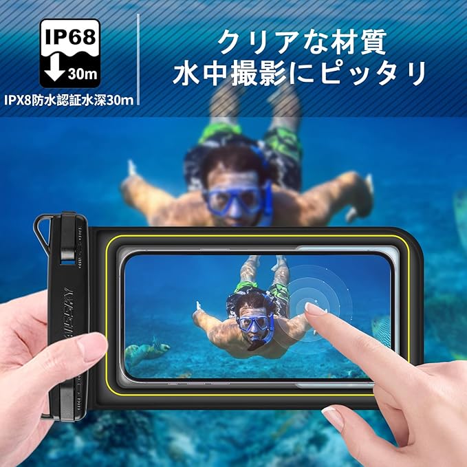 「IPX8認証・完全防水」このスマホ防水ケースは水に浮かべます。4層構造のため完全防水、完全防塵をすることが出来ます。また、防塵、耐寒、耐傷、耐圧に強いTPU素材で作られて、水深30mの環境でも30分間の防水ができ、全方位的な保護を提供し、安心に水中撮影が楽しめます。