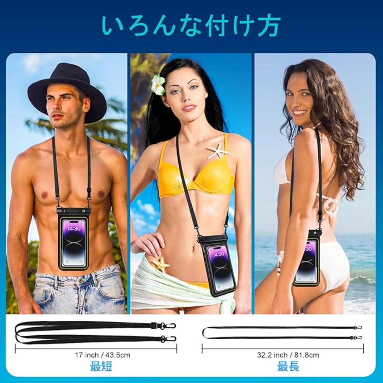 「特別設計・水に浮く」「U型フローティング構造」が採用されており、ボーダー部分が空気がいれたため浮き輪となれて、例え携帯防水ケースが海に落とされても、とにかく沈みません。更に、このデザインで落下した衝撃を分散・吸収し、中身のスマホ
