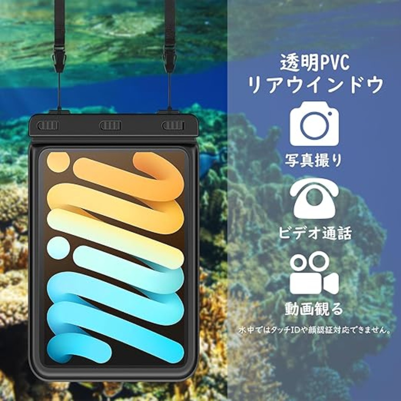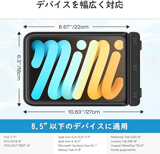 「8.5インチまでのタブレット適用」8.5インチまでのタブレット用スタンド仕様の透明防水ケースです。iPad Mini 6 2021、iPad mini 5 2019、iPad Mini4、iPad Mini3、iPad Mini2、iPad Mini1、fire HD 8 /8Plus 2020、fire 7、kindle paperwhite 2021/2018、Kindle Oasis 2019/2017、バンキョー S7/S8、COOPERS CP80、Lenovo Tab M7、Dra
