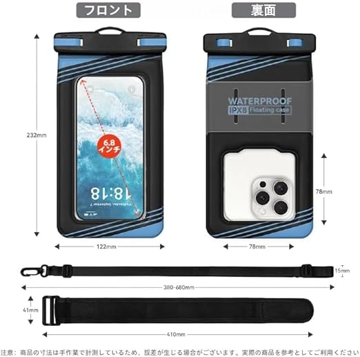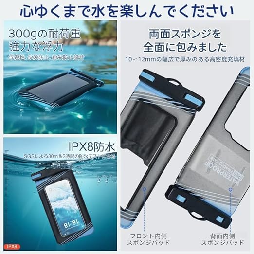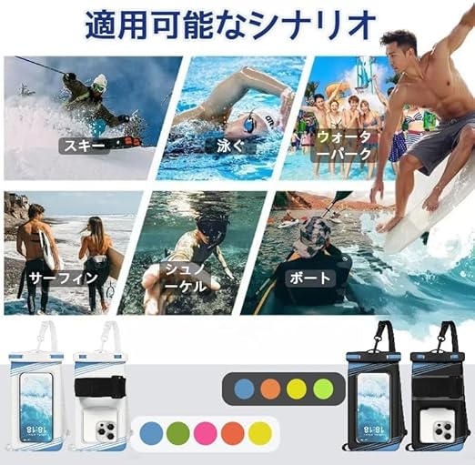 【2025新型エアバツグ設計・安心対策】 スマホ用防水ケースは、背面に水に浮く特殊な「エアバッグ構造」を採用しています。 背面の浮き輪で海やプールに落ちても自然に浮き上がり、沈まなくてスマホの紛失を防ぎます。また、通常の防水カバーよりも耐衝撃性に優れています。エアバッグ構造により、落下などの衝撃を分散させ、砂やホコリなどが直接触れることがありません。過酷な環境下でも高い耐衝撃性を発揮し、スマホを全方位からしっかりと守ります。