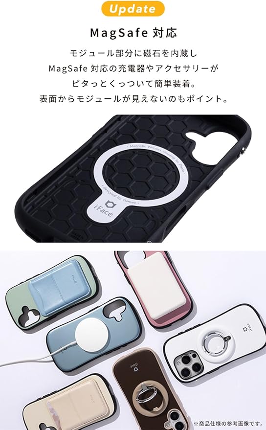 MagSafe対応で、新たに生まれ変わった定番シリーズ。長年愛されているデザイン、安心の耐衝撃性、持ちやすさはそのままに、iFace First ClassにMagSafeの機能が加わりました。MagSafe対応のスマホリングやウォレットが装着でき、自分好みにカスタマイズOK。