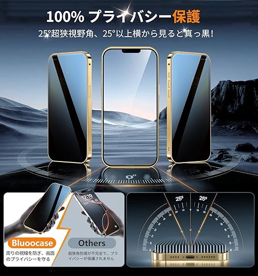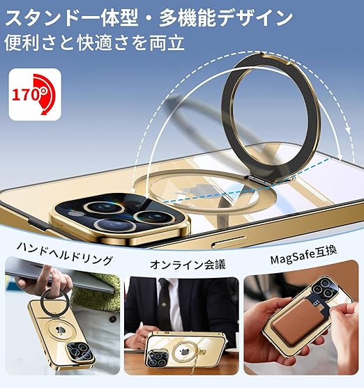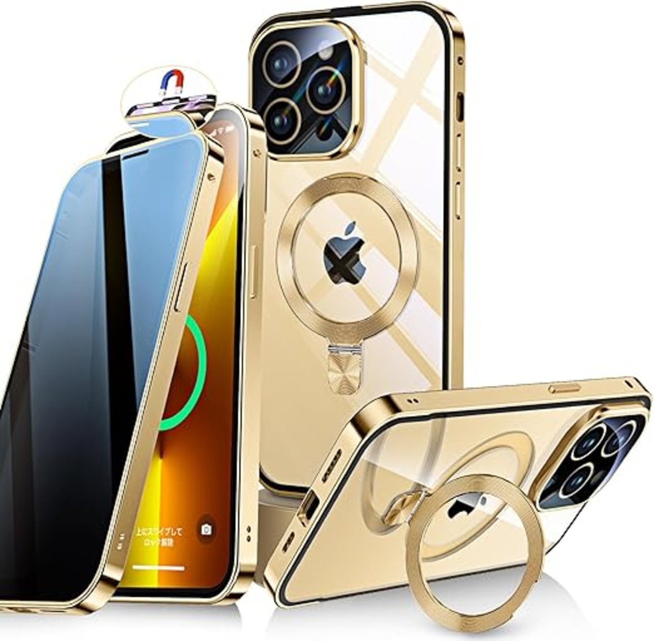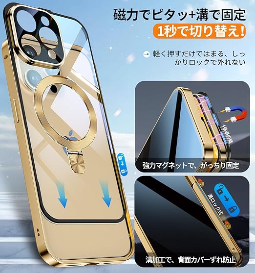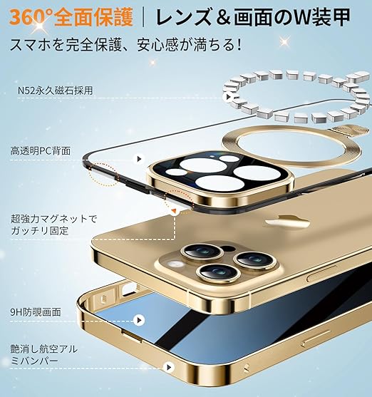 Bluoocase【磁石+溝二重自動ロック!3in1スタンド・覗き見防止】iPhone 13 Pro Max 用 ケース 全面保護 Magsafe対応・CDリング 縦横両立 アイフォン13プロマックス カバー 9H強化ガラス 両面 一体型レンズ保護 高感度タッチ ストラップホール付き 透明 PC背面 アルミバンパー いphone13pro max 用 携帯ケース 6.7インチ(ゴールド) a